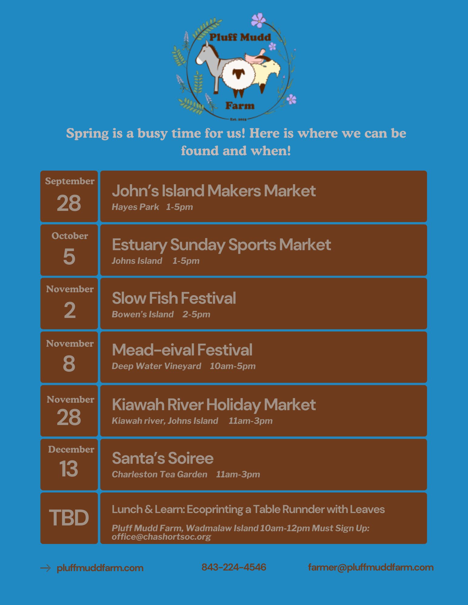 You can PM us on our Pluff Mudd Farm Facebook or Instagram pages or email us at farmer@pluffmuddfarm.com